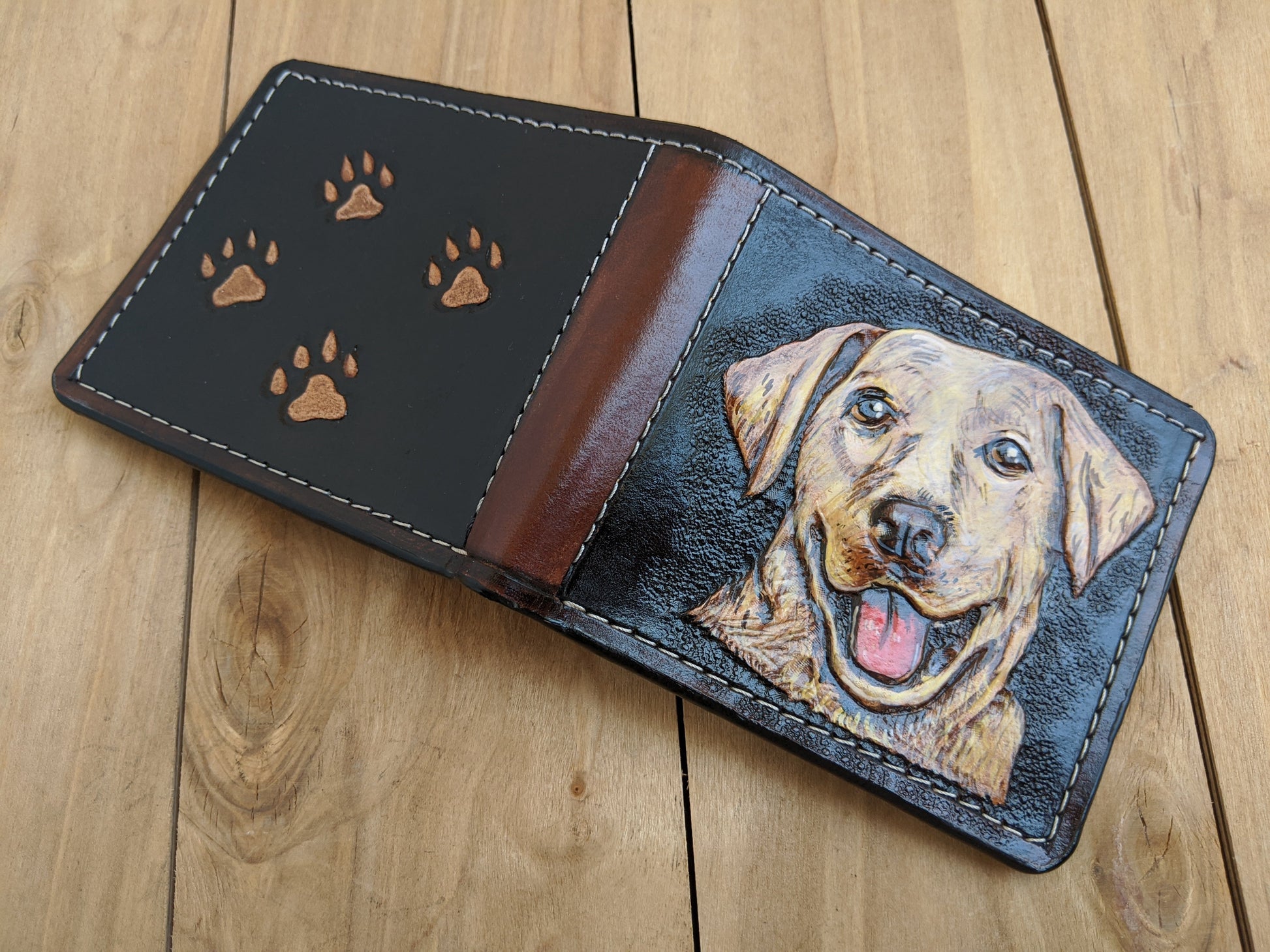 Celebrate your love for Labrador Retrievers with this handmade leather bifold wallet featuring an embossed and custom paw or pet portrait design. Perfect for dog lovers, this wallet combines artistic craftsmanship with everyday practicality. It’s equipped with RFID protection to keep your information secure and built with durable leather for long-lasting use. An ideal gift for pet owners, dog enthusiasts, or anyone who cherishes their furry friends—perfect for any special occasion.